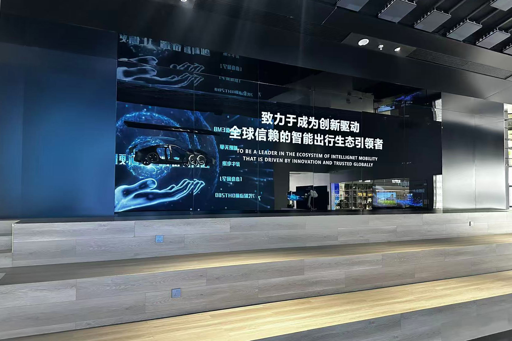 展廳中部設(shè)有展示臺(tái),融合多媒體互動(dòng)屏幕與關(guān)鍵實(shí)物展示,重點(diǎn)呈現(xiàn)奇瑞“瑤光2025”戰(zhàn)略五大核心技術(shù)板塊。